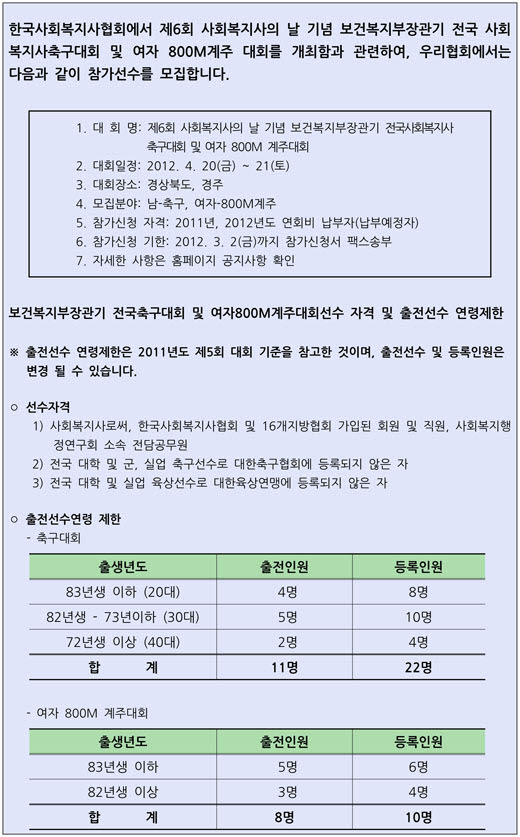 제6회 전국사회복지사 축구대회 및 여자 800M계주대회 경북대표팀 선수모집 안내